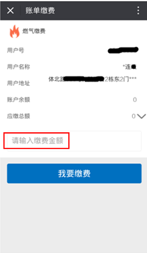 4.點(diǎn)擊我要查詢(xún)后,進(jìn)入“賬單繳費(fèi)”界面,界面會(huì)出現(xiàn)繳費(fèi)戶(hù)的基本信息,繳費(fèi)前請(qǐng)認(rèn)真核對(duì)信息是否準(zhǔn)確,如無(wú)誤在“請(qǐng)輸入繳費(fèi)金額”空白處輸入繳費(fèi)金額,點(diǎn)擊“我要繳費(fèi)”。
