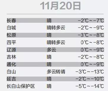 19日白天,吉林省大部分城市的最高氣溫為-6℃~-9℃,20日白天,吉林省大部分城市的最高氣溫為0℃~-3℃。以長(zhǎng)春為例,今天的最高氣溫為-8℃,明天的最高氣溫為-2℃,回升了6℃。