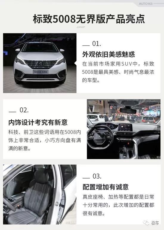 5008無界版,在熱銷車型“精英版”的基礎上,增加了一系列品質(zhì)裝備,座椅舒適度全面提升:全員Claudia真皮座椅;前排座椅加熱和電動腰部調(diào)節(jié);副駕駛座椅8向電動調(diào)節(jié)和后排電動可調(diào),給鐘情7座SUV,注重駕乘品質(zhì)的用戶提供更多產(chǎn)品選擇。