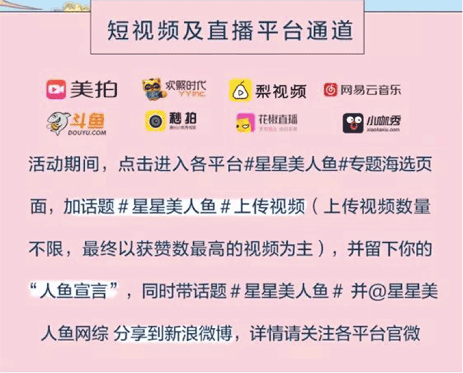 《星星美人魚(yú)》全網(wǎng)海選活動(dòng)由微博、YY、美拍、小咖秀、梨視頻、秒拍、花椒直播、斗魚(yú)直播、網(wǎng)易云音樂(lè)九大平臺(tái)聯(lián)合全網(wǎng)共同開(kāi)啟。目前正在如火如荼的進(jìn)行中,參賽的美人魚(yú)選手們將通過(guò)獨(dú)角戲、多人對(duì)戲等方式模仿星爺經(jīng)典的電影片段,并拍攝視頻上傳至各海選平臺(tái),相信她們精彩的表演一定會(huì)引來(lái)更多網(wǎng)友的圍觀和參與。