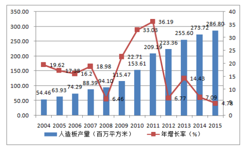 2004-2015年我國人造板產(chǎn)量及同比增長率