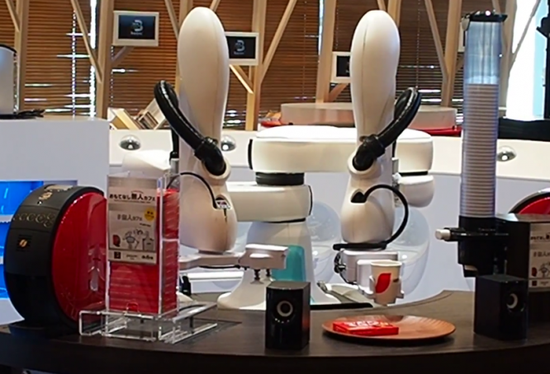這家無人咖啡店由雀巢、軟銀和川崎重工聯(lián)合打造,軟銀公司的人形機(jī)器人Pepper負(fù)責(zé)點(diǎn)單,通過它胸口的觸摸屏,客人選擇想要喝的咖啡類型,完成下單后,吧臺(tái)內(nèi)的川崎重工機(jī)械臂負(fù)責(zé)操作雀巢咖啡機(jī),兩條機(jī)械臂互相配合,啟動(dòng)咖啡機(jī)、取紙杯、接咖啡,最后將咖啡和糖及咖啡伴侶一同放置到托盤里。