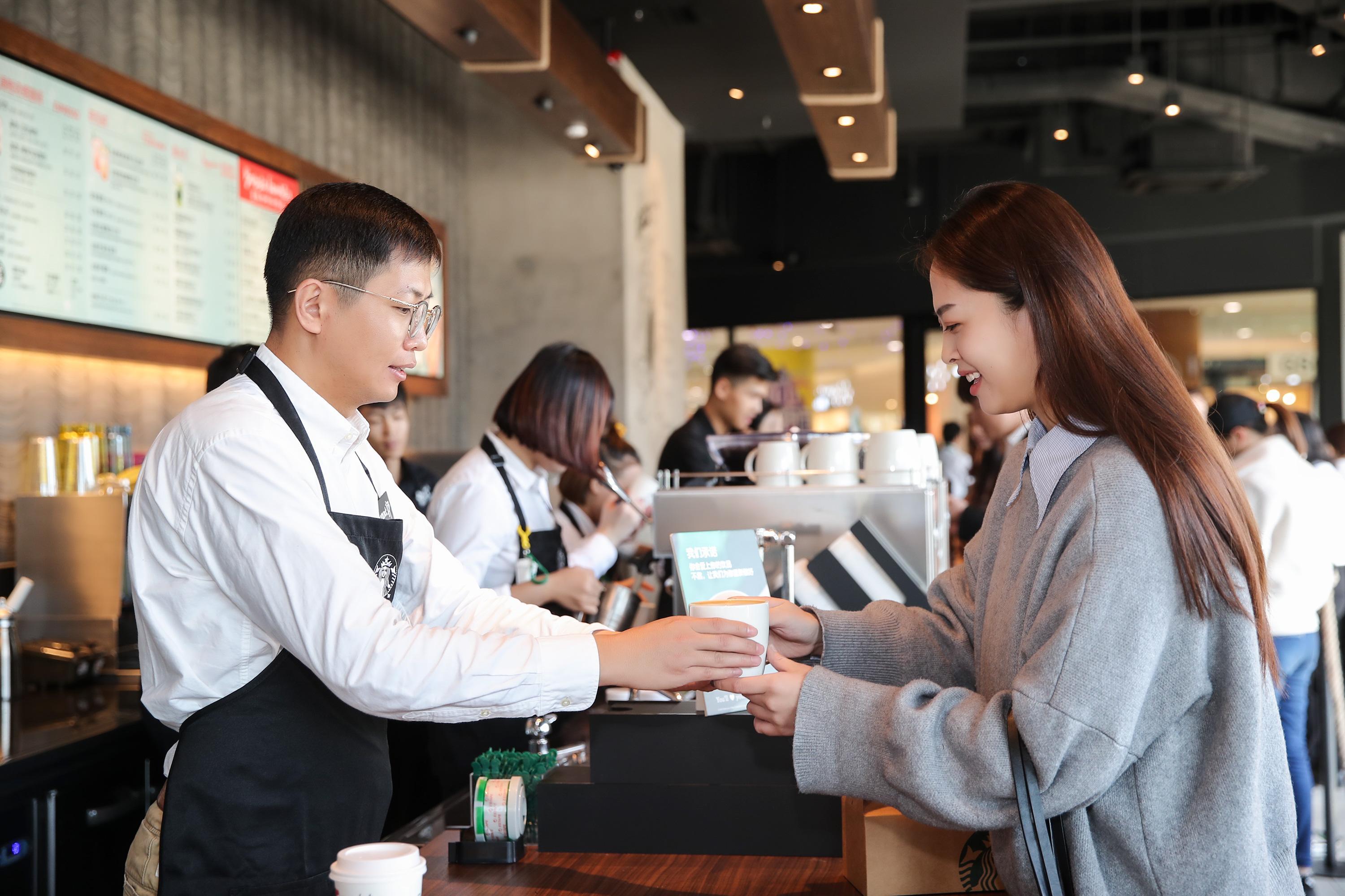 星巴克中國北區(qū)營運總監(jiān)郭丹為衡水第一位顧客遞上咖啡