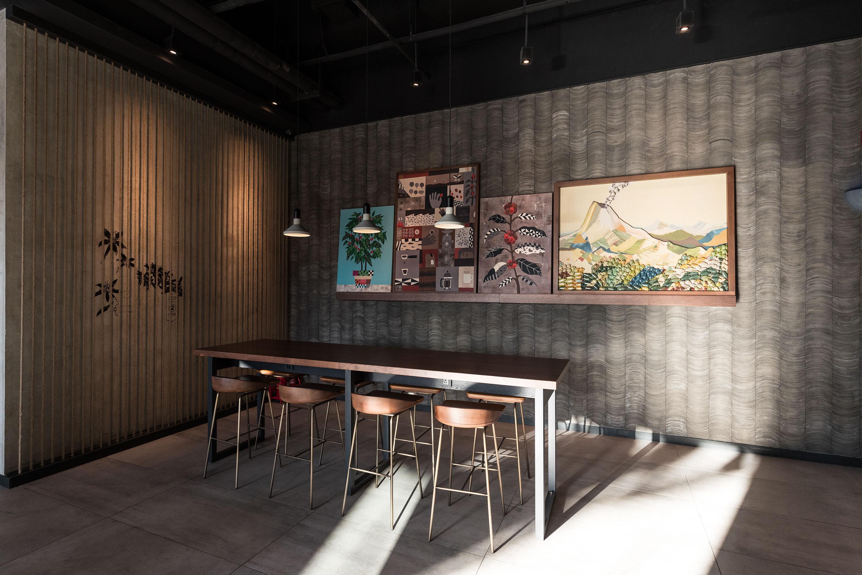 未入店門,便可看到星巴克綠色美人魚的logo鑲嵌于古瓦墻上,巧妙借鑒衡水老城墻;店內(nèi)最引人矚目的咖啡吧臺,以古香古色的青瓦片為背景,時尚優(yōu)雅與大氣厚重,就此創(chuàng)意相融。環(huán)顧店內(nèi),繪有飽滿紅色咖啡漿果和蔥郁咖啡樹葉的精致壁畫,讓人轉(zhuǎn)角便能偶遇來自熱帶的親切問候;舒適的座位設(shè)計、開放式的咖啡吧臺、木質(zhì)的高腳凳,是處處可見的愜意溫馨。最為特別的是,西雅圖藝術(shù)家創(chuàng)作的咖啡種植地帶風(fēng)貌,巧妙結(jié)合了“衡水三絕”之一——內(nèi)畫鼻煙壺,跨界創(chuàng)作了一幅墻面藝術(shù),令咖啡靈感融入古樸的文化寶藏。