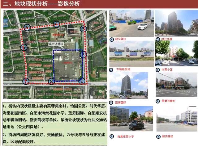 街坊現狀:目前街坊內主要有芙蓉苑南村、怡園公寓、時代華庭、海棠花園南區、合肥市海棠花園小學、藍籌國際、合肥順安機動車輛監測站、新安駕校等單位。擬出讓地塊現狀為公共交通站場用地(公交四保場)。