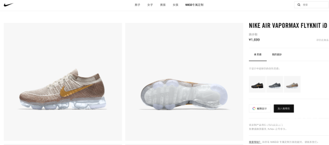 在耐克官網(wǎng),你已經(jīng)可以開始設(shè)計(jì)著手設(shè)計(jì)自己全新 Nike Air VaporMax,價(jià)格為 1699 元,如果覺得自己不夠特立獨(dú)行,不妨定制一段試試。