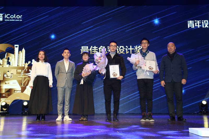 最佳色彩設(shè)計獎獲得者為來自成都大學(xué)的曾朝宇,來自同濟(jì)大學(xué)的陸奕寧以及設(shè)計師李傲芳與頒獎嘉賓共同合影留念。