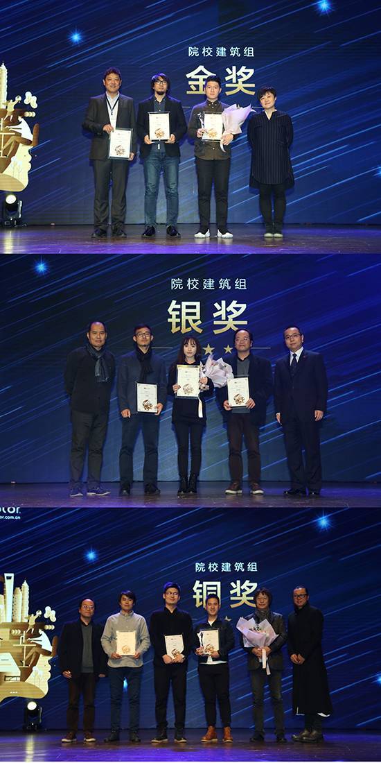 建筑組金獎獲得者來自廣州美術(shù)學(xué)院的吳澤宇、 銀獎獲得者來自同濟(jì)大學(xué)的蔡慶瑜、銅獎獲得者來自中央美術(shù)學(xué)院的孫文王一鼎及他們的導(dǎo)師們與頒獎嘉賓共同合影留念。