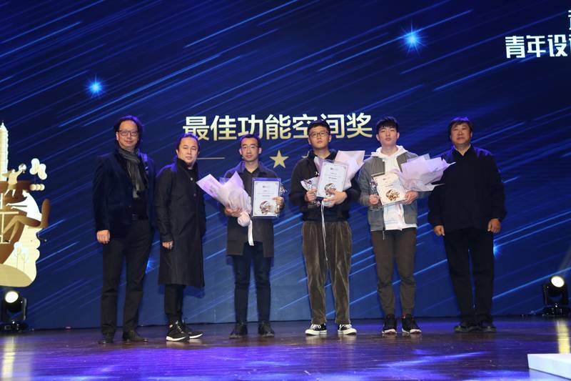 最佳功能空間獎獲得者為來自武漢理工大學(xué)的張陽,來自上海應(yīng)用技術(shù)大學(xué)的葉鑫凱以及設(shè)計師潘錦秋與頒獎嘉賓共同合影留念。
