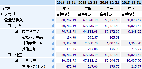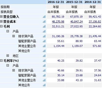 從好太太產(chǎn)品業(yè)績數(shù)據(jù)可以看出,公司產(chǎn)品的毛利及毛利率表現(xiàn)亮眼,主要表現(xiàn)在其晾衣架產(chǎn)品上。2014-2016年,晾衣架產(chǎn)品分別貢獻(xiàn)了2.15億元、2.58億元以及3.12億元,毛利率分別為37.47%、39.82%以及40.66%。除此之外,公司智能家居以及其他業(yè)務(wù)為公司貢獻(xiàn)的毛利有限,智能家居產(chǎn)品毛利率在近三年均不及核心產(chǎn)品晾衣架,成長性有待觀望。