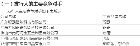 在同行業(yè)競爭中,好太太的行業(yè)競爭對(duì)手主要有以下5家公司,這5家無一家在A股上市,因此無法準(zhǔn)確得知同行業(yè)主要企業(yè)的資產(chǎn)規(guī)模、生產(chǎn)銷售規(guī)模、發(fā)行人在同行業(yè)的市場占有率等情況。