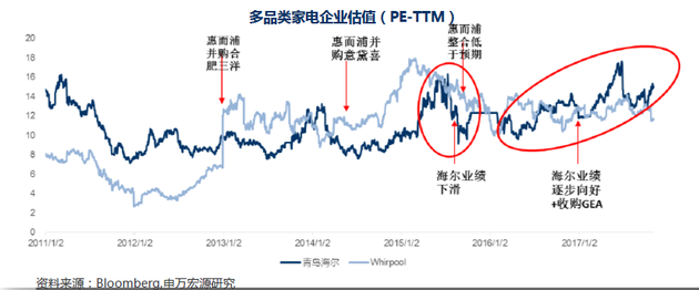 ①青島海爾估值與惠而浦美國(guó)基本趨同。15年估值處于底部(業(yè)績(jī)下降19%),但自從并購(gòu)GE開啟全球經(jīng)營(yíng),渠道調(diào)整內(nèi)生增長(zhǎng)全面向好,估值從2016年末以來(lái)持續(xù)提升。