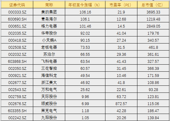 其中,家電板塊最受益A股國(guó)際化進(jìn)程,PE中樞較歷史均值溢價(jià)率明顯。年初以來(lái),美的集團(tuán)、青島海爾、格力的漲幅也是相當(dāng)驚人。