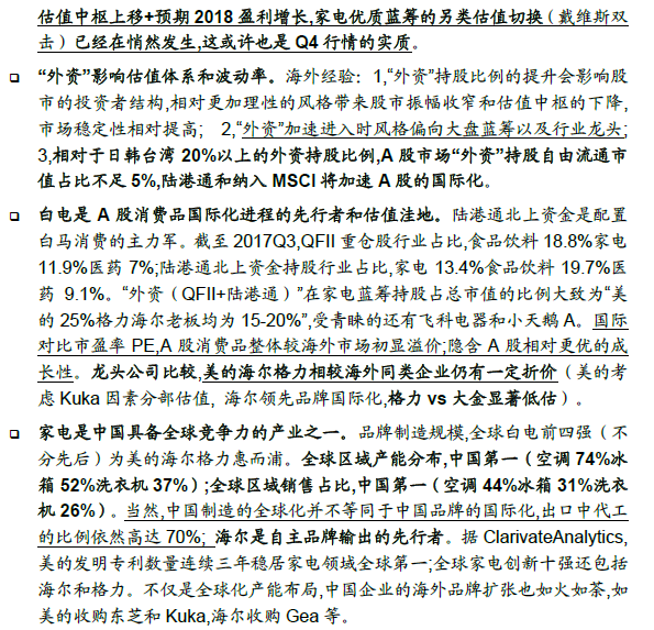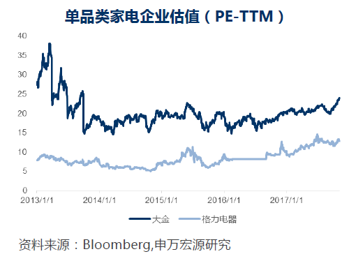 先分享申萬(wàn)宏源證券最新出爐的這份2018年家電股投資策略報(bào)告顯示,國(guó)內(nèi)多元化家電企業(yè)估值體系(海爾、美的)正在追趕海外龍頭,但依舊有空間;國(guó)內(nèi)單品類家電企業(yè)估值體系(格力VS大金)則低估明顯。