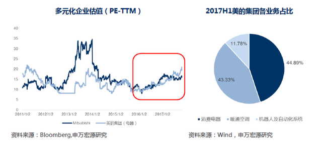 ②美的因KUKA業(yè)務(wù)發(fā)展前景廣闊、公司治理優(yōu)秀、激勵(lì)機(jī)制靈活,市場(chǎng)逐步給予美的相對(duì)其他龍頭更多溢價(jià),估值也從2016年初9倍左右上漲到20倍左右。