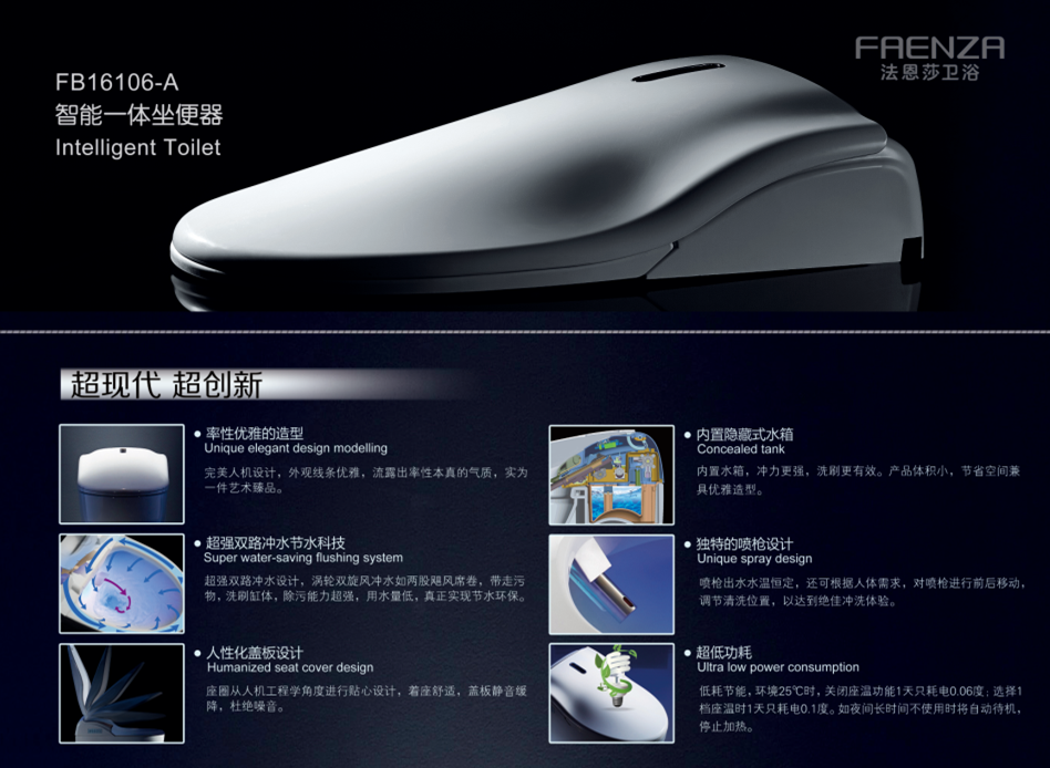 法恩莎衛(wèi)浴智能馬桶FB16106-A采用人性化設(shè)計(jì),就算在寒冷的冬季,也能讓父母安享溫暖瞬間;無(wú)聲設(shè)計(jì),再也不用擔(dān)心父母醒后無(wú)法安心入睡;超低功耗,讓節(jié)儉了一輩子的父母放心使用;\u00A0三防一護(hù)全效凈化除臭系統(tǒng),輕松告別臭氣熏人舊衛(wèi)浴時(shí)代,迎接無(wú)菌無(wú)臭好生活,讓父母享受滿屋清新,呵護(hù)健康愛(ài)的。