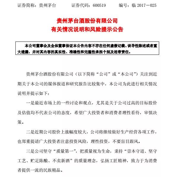 從“好股”茅臺到“瘋股”茅臺 至少到現(xiàn)在,沒有人會否認(rèn)茅臺是一只好股票。業(yè)績突出、堅守品質(zhì)等等因素都是市場看好茅臺的理由。 今年以來,茅臺股價從327元附近起步,400、500、600、700!茅臺股價連破四個整數(shù)關(guān)口,一路高歌猛進(jìn),“瘋股”之像逐漸顯露。 股價400元時,茅臺已成為“宇宙第一大酒業(yè)”,但股價還在漲; 股價600元時,已有一半股民買不起一手茅臺,但股價還在漲; 股價突破700元時,網(wǎng)友戲稱貧窮限制了我們的想象,這個時候多數(shù)機(jī)構(gòu)依然看漲,“看七望八”的大有人在。 股價“太瘋”,連茅臺自己都看不下去了。 11月16日晚,貴州茅臺發(fā)布風(fēng)險提示公告稱:最近市場上的一些討論和觀點(diǎn),尤其是關(guān)于公司過高的目標(biāo)股價及估值均不代表公司的態(tài)度,希望廣大投資者和消費(fèi)者理性看待,審慎決策。近期公司股價上漲幅度較大,公司將繼續(xù)做好生產(chǎn)經(jīng)營各項(xiàng)工作,提請廣大投資者注意投資風(fēng)險,理性投資,不要盲目跟風(fēng)。