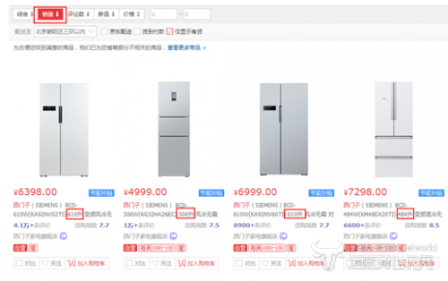 運(yùn)營(yíng)商世界網(wǎng)編輯在京東平臺(tái)上搜索西門(mén)子冰箱,發(fā)現(xiàn)其按銷量排名的話,450升以上大容量冰箱產(chǎn)品很多,價(jià)格在6000元以上。
