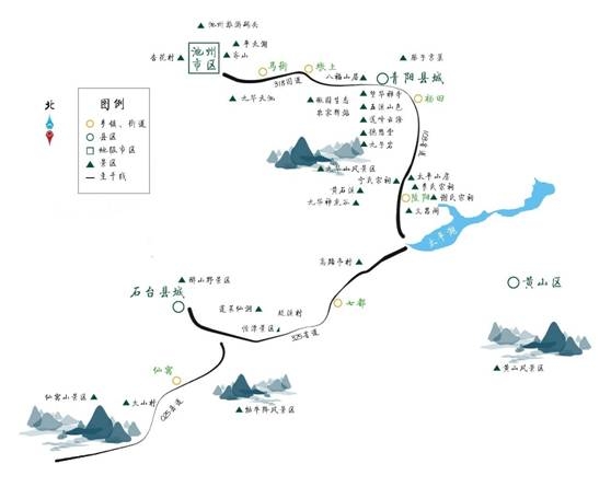自駕路線:池州城區(qū)—杏花村—平天湖—齊山—九華天池—青陽(yáng)縣城—九華山—黃石溪—陵陽(yáng)古鎮(zhèn)—石臺(tái)縣城—秋浦河—仙寓山