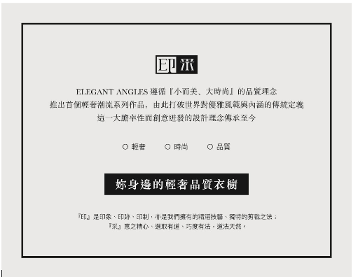 印采ELEGANT ANGLES源自法式優(yōu)雅為靈感,打破常規(guī)以混搭、多元化為設(shè)計(jì)手法,并融合歐洲流行元素和文化底蘊(yùn)加入東方的設(shè)計(jì)理念,專為心理年齡定位23-35歲女性提供法式優(yōu)雅性感時(shí)尚服飾,創(chuàng)造出新一代都市女性的獨(dú)特、年輕、時(shí)尚、個(gè)性的時(shí)裝品牌。從設(shè)計(jì)到工藝、從顏色到板型、從細(xì)節(jié)到搭配,無(wú)不“混”得優(yōu)雅。印采ELEGANT ANGLES從電影、音樂、繪畫等各類藝術(shù)中汲取靈感結(jié)合潮流,激發(fā)創(chuàng)意展現(xiàn)女性自在自信,由心而發(fā)的優(yōu)雅摩登氣質(zhì)風(fēng)格。