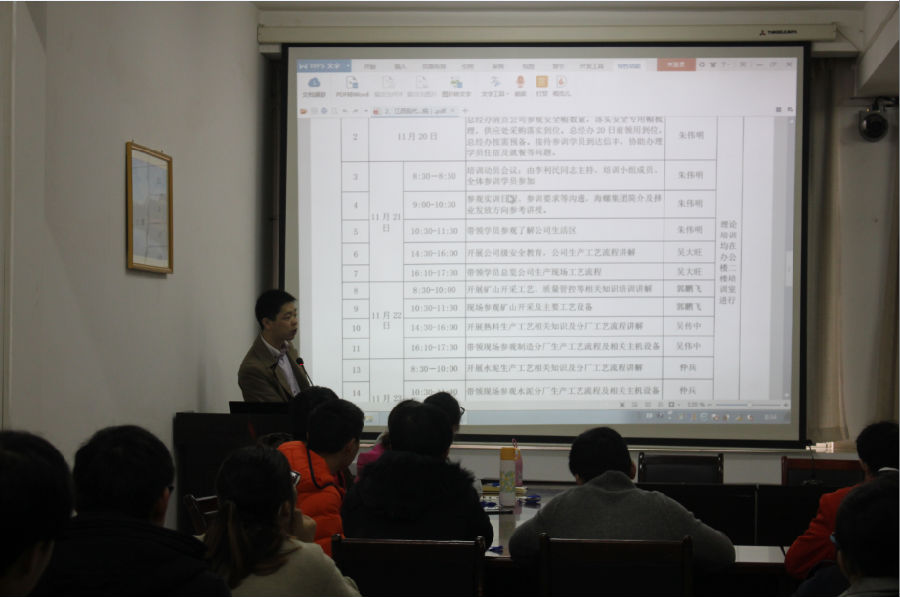 \u00A0 \u00A0海螺水泥有限責任公司生產安全處副處長吳大旺為同學們開展了安全教育培訓,詳細介紹了安全生產、安全管理知識,要求大家提高安全意識。作為校外導師,吳大旺還進行理論授課,從企業(yè)生產角度詳細描繪“兩磨一燒”的生產流程,生動詮釋各個主要生產關鍵點。吳大旺與同學們交流互動,耐心回答同學們的提問,同學們鞏固了所學的理論知識,受益良多。