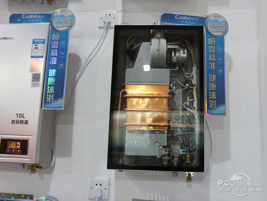 康寶的多款中高端燃?xì)鉄崴鞫寄軐?shí)現(xiàn)數(shù)碼恒溫,展臺(tái)還有一臺(tái)機(jī)器來(lái)展示燃?xì)鉄崴鞯膬?nèi)部結(jié)構(gòu)。