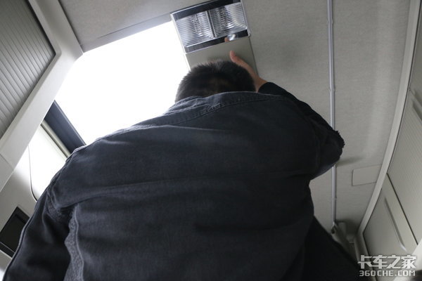 FH16駕駛室的縱向空間有多大?圖片中的媒體老師身高接近1.9米,在站立的情況下頭部仍有一定空間,皮尺在這里已經(jīng)毫無意義。