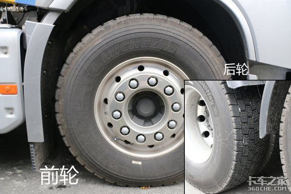 前輪胎為米其林的385/65 R22.5,后輪胎為米其林的315/80 R22.5,并且后輪胎的花紋更加強調(diào)抓地力。另外,該車的所有車輪均配有美鋁所生產(chǎn)的鋁合金輪輞。
