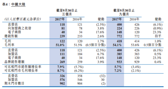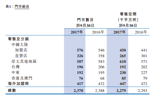 據(jù)公告顯示,與2016年同期相比,門店總數(shù)減少18間,主要是因為關閉印度29間表現(xiàn)較差門市所致,集團正在對印度市場進行業(yè)務重組。中國大陸直營店現(xiàn)有326家,比2016年同期減少了32家。