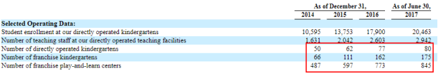 截至2017年6月,紅黃藍的直營園有80家,加盟園有175家,親子園有845家。這個親子園類似興趣班,基本上都是加盟模式,直營加盟比例為1:12.75。