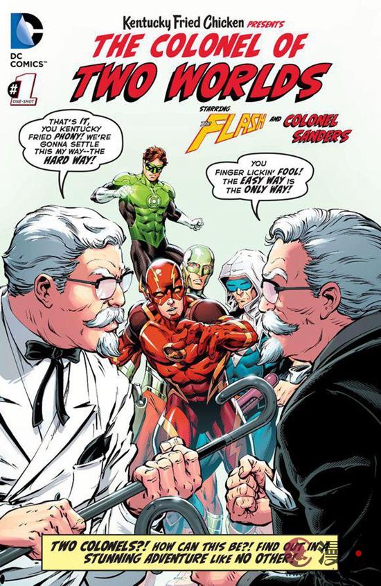 早在,2015年,肯德基和著名漫畫公司 DC 漫畫聯(lián)合推出了一部名為 《兩個(gè)世界的上校》的漫畫,在漫畫中,山德士上校與超級(jí)英雄們上演了一場穿越大戲。