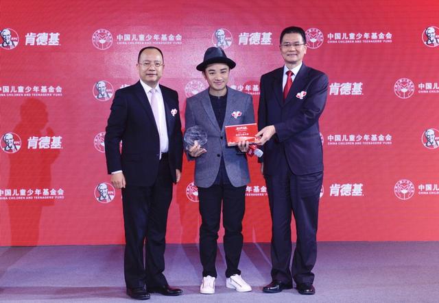 肯德基中國(guó)總經(jīng)理黃進(jìn)栓(右一)、中國(guó)兒童少年基金會(huì)秘書(shū)長(zhǎng)朱錫生(左一),為王祖藍(lán)授予小候鳥(niǎo)基金明星公益大使證書(shū)和獎(jiǎng)杯