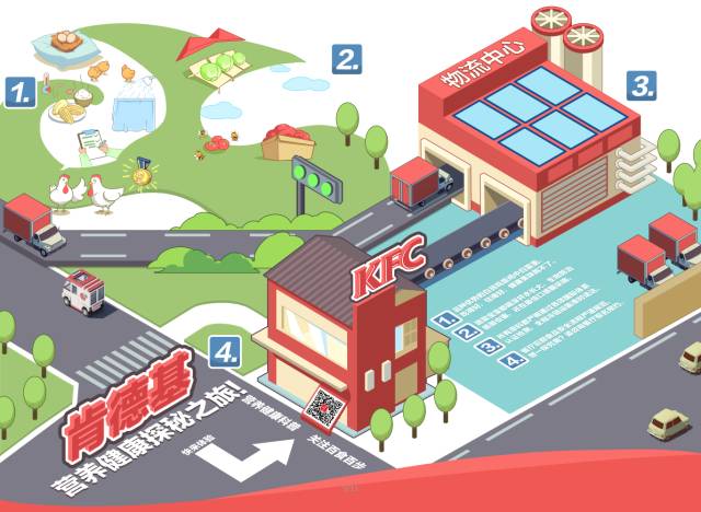 “肯德基營養(yǎng)健康探秘之旅”是這幅漫畫的背景活動(dòng),它真正的名字叫做“肯德基食品安全流程圖”,基本呈現(xiàn)了從白羽雞養(yǎng)殖、蔬菜種植到檢驗(yàn)檢疫、物流運(yùn)輸,再到原料進(jìn)入肯德基餐廳的全部環(huán)節(jié)。