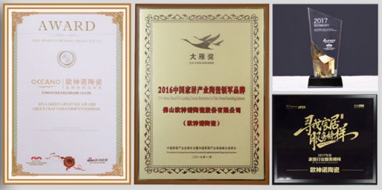 截止到2017年,歐神諾陶瓷共獲得200多項(xiàng)榮譽(yù)獎(jiǎng)項(xiàng)和專利認(rèn)證,努力成為大家心目中值得信賴的品質(zhì)瓷磚品牌。
