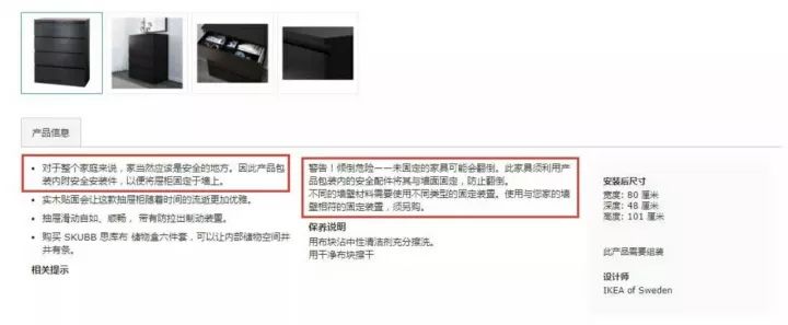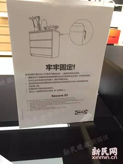 不得不說,這款抽屜柜在展示區均有“牢牢固定”的提示,并且在說明書上也有相關提醒。因此,有人認為既然已設置提醒,仍然堅持不固定導致傾覆的,就怪不得宜家了。