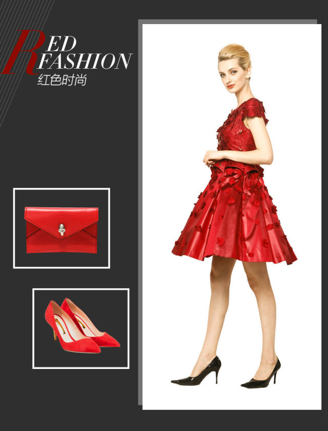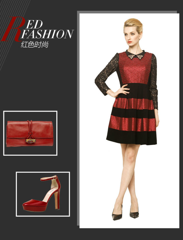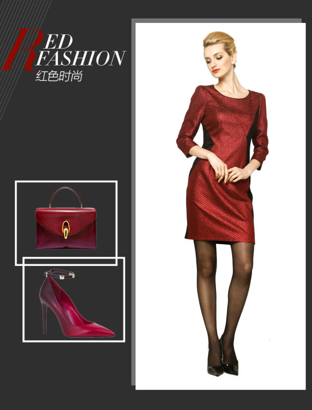 大面積的紅色著裝可能會顯得有些過 ,而用配飾或小面積點綴就是更為合適的方式。黑色針織與提花的不對稱拼接,身材曲線被優(yōu)化,整個造型優(yōu)雅范兒更加凸顯。