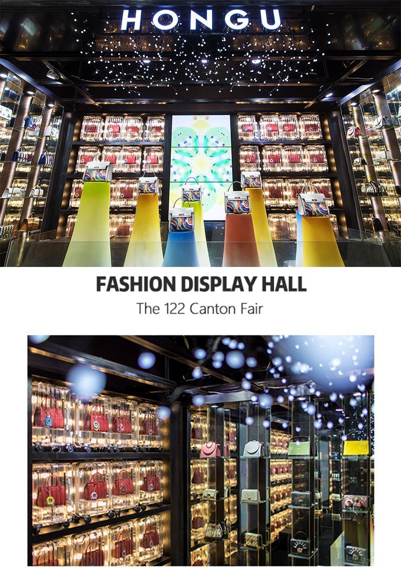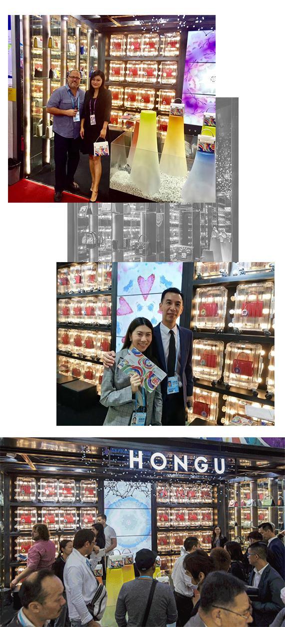 \u00A0\u00A0\u00A0\u00A0其設(shè)計(jì)靈感來源于HONGU的LOGO形象,以“H”為中心,再以炫麗色塊進(jìn)行延展。如花朵綻放般絢麗而耀眼,也象征著紅谷的發(fā)展越來越強(qiáng)。 \u00A0\u00A0\u00A0\u00A0展廳內(nèi),簡(jiǎn)單的點(diǎn),線,面空間布局,配以獨(dú)特的陳列擺放,將產(chǎn)品賦予一種藝術(shù)的魅力,讓賓客仿佛置身于藝術(shù)展覽館中。 \u00A0\u00A0\u00A0\u00A0中島臺(tái)設(shè)計(jì)如同“炫麗煙霧火山”,九個(gè)火山模型上均陳列著HONGU專門為廣交會(huì)而設(shè)計(jì)的最新包款,體現(xiàn)了紅谷品牌無限的活力以及全新的蛻變。展廳以黑色、紅色、白色為三大主色調(diào),展廳內(nèi)以紅谷近期爆款之一的紅色包款作為主陳列款,清一色的紅色包包配以不同花型的吊飾。值得一提的是,每一個(gè)包包都陳列在一個(gè)透明拉桿箱內(nèi)。再加上燈光及LED特效的渲染,整體視效高檔大氣,時(shí)尚而靈動(dòng)。憑借獨(dú)特的立體空間感及前衛(wèi)大膽的色彩運(yùn)用,受到會(huì)上眾多賓客的交口稱贊。