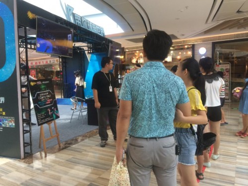(現(xiàn)場(chǎng)觀(guān)眾排隊(duì)等待體驗(yàn)VR游戲)