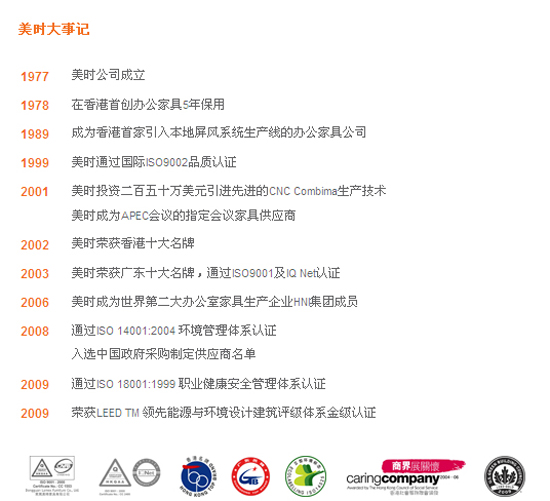 \u00A0\u00A0\u00A0\u00A0\u00A0\u00A0\u00A0 不斷研發(fā)、設(shè)計和生產(chǎn)創(chuàng)新的產(chǎn)品及服務(wù)使美時辦公家具保持了節(jié)節(jié)領(lǐng)先的地位。美時辦公家具品牌已經(jīng)成為滿足不同需求的高品質(zhì)產(chǎn)品、高附加值服務(wù)和可持續(xù)發(fā)展的代名詞。作為行業(yè)領(lǐng)先者,美時于成立之初的1978年就在香港率先提出了家具保用5年的質(zhì)量承諾,并一直堅持至今;1991年美時辦公家具就成為香港首家提供電腦設(shè)計和電腦模擬服務(wù)的辦公家具公司;2001年美時辦公家具成為APEC會議家具指定供應(yīng)商。