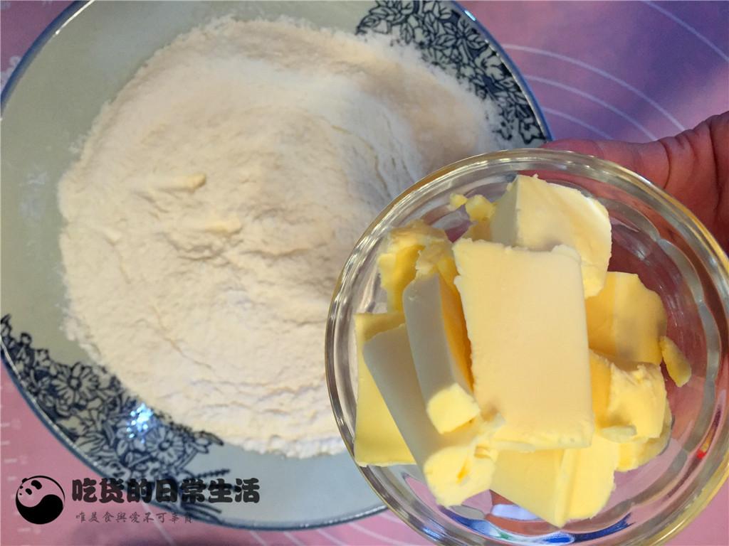 3、把切成小塊的黃油倒入混合好的面粉中。