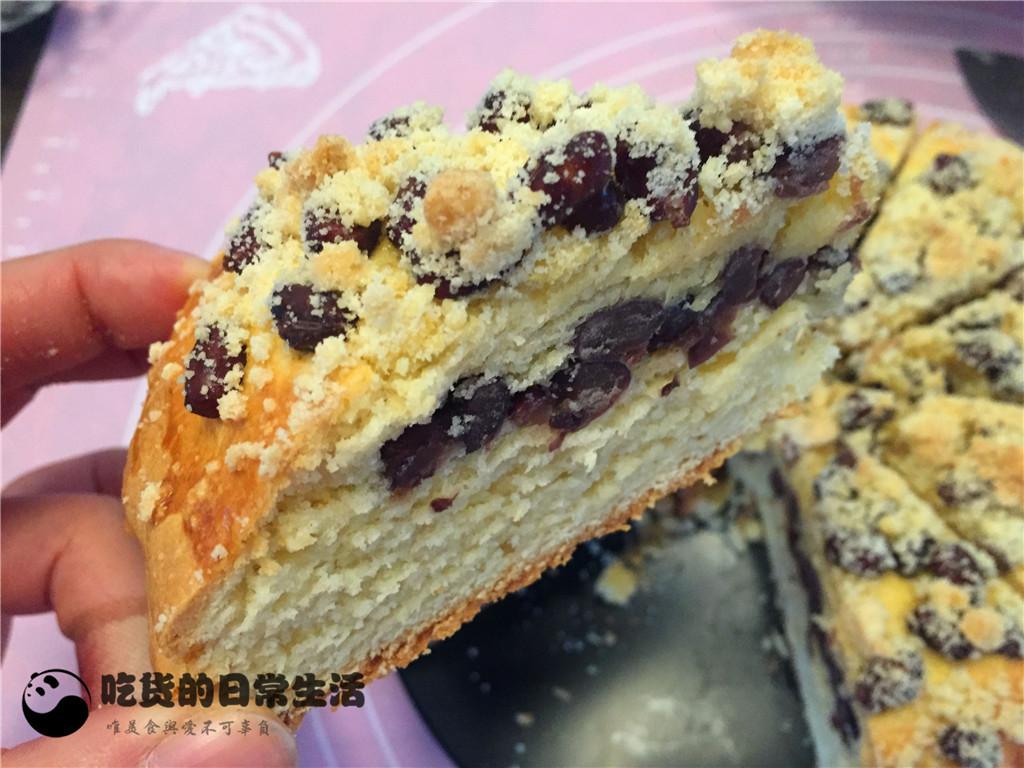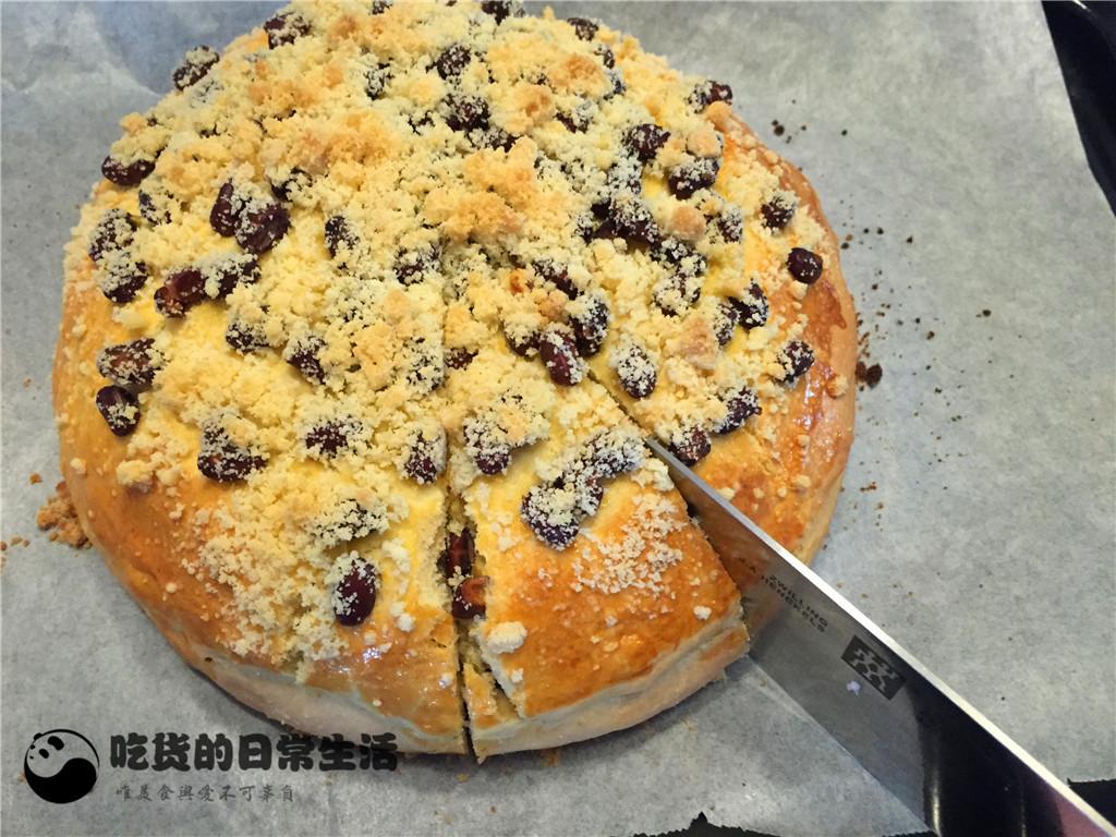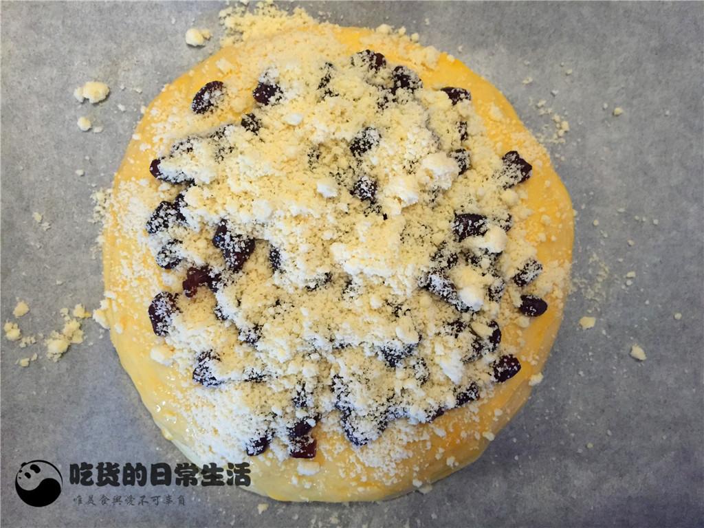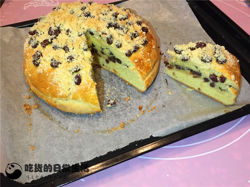 14、然后在表面均勻的撒上少許蜜豆。再把剩下的酥粒全部撒在表面,餅體就完全完成了,把做好的餅放在一旁讓面餅松弛30分鐘。