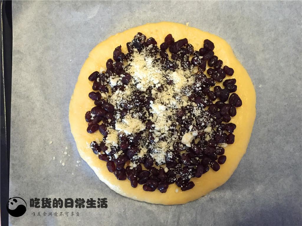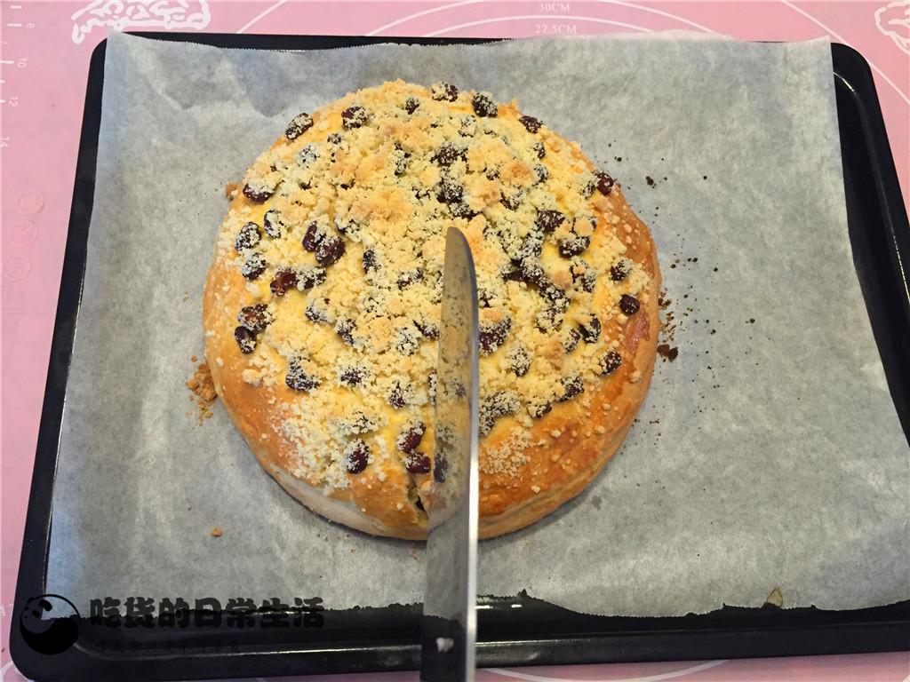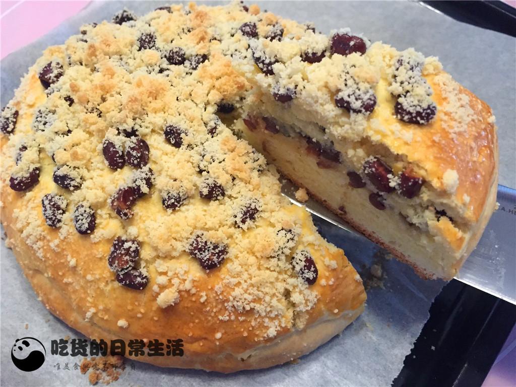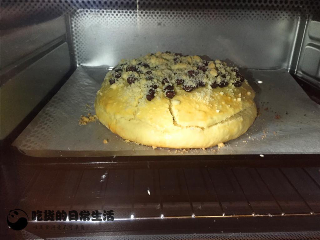 14、然后在表面均勻的撒上少許蜜豆。再把剩下的酥粒全部撒在表面,餅體就完全完成了,把做好的餅放在一旁讓面餅松弛30分鐘。