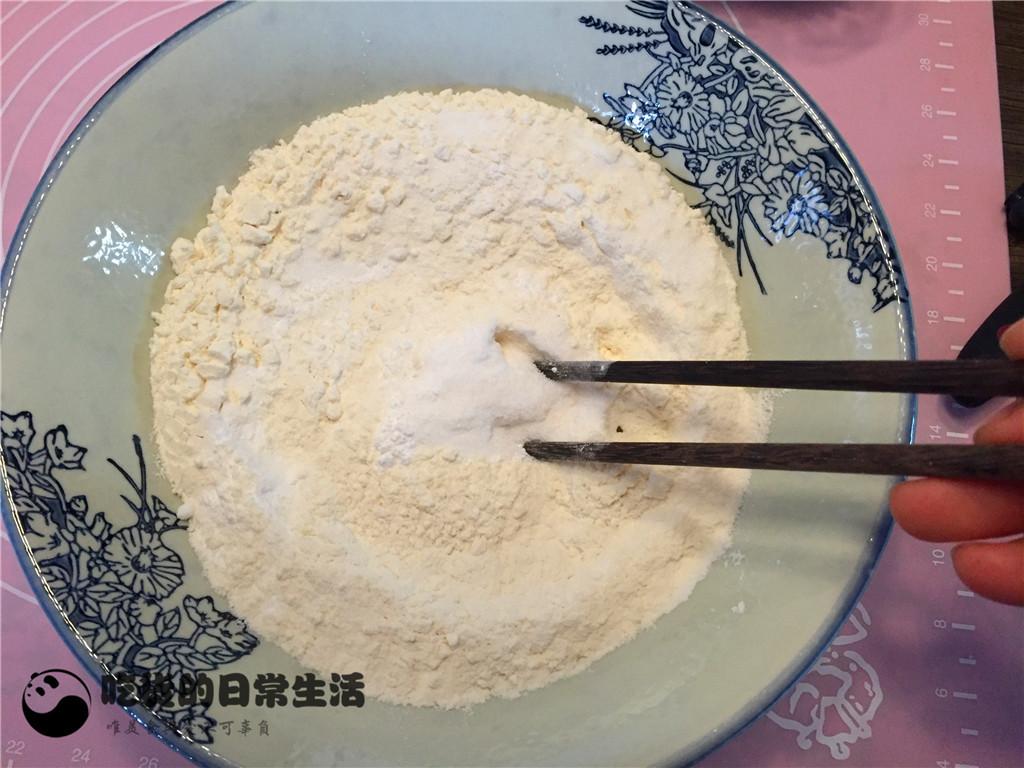 2、分別將低筋粉、糖粉、泡打粉、小蘇打、食鹽倒入準備好的碗中,用筷子攪拌均勻。