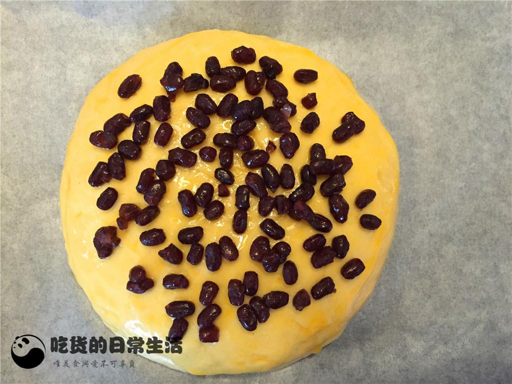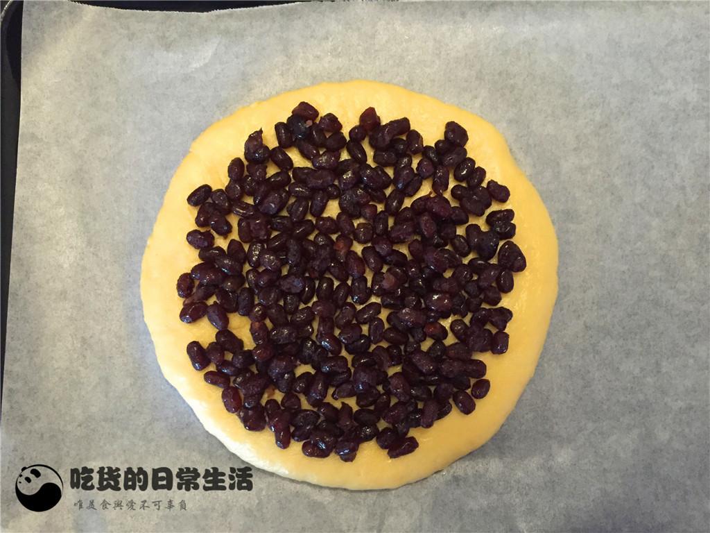 10、在面餅上均勻的鋪上一層蜜豆。