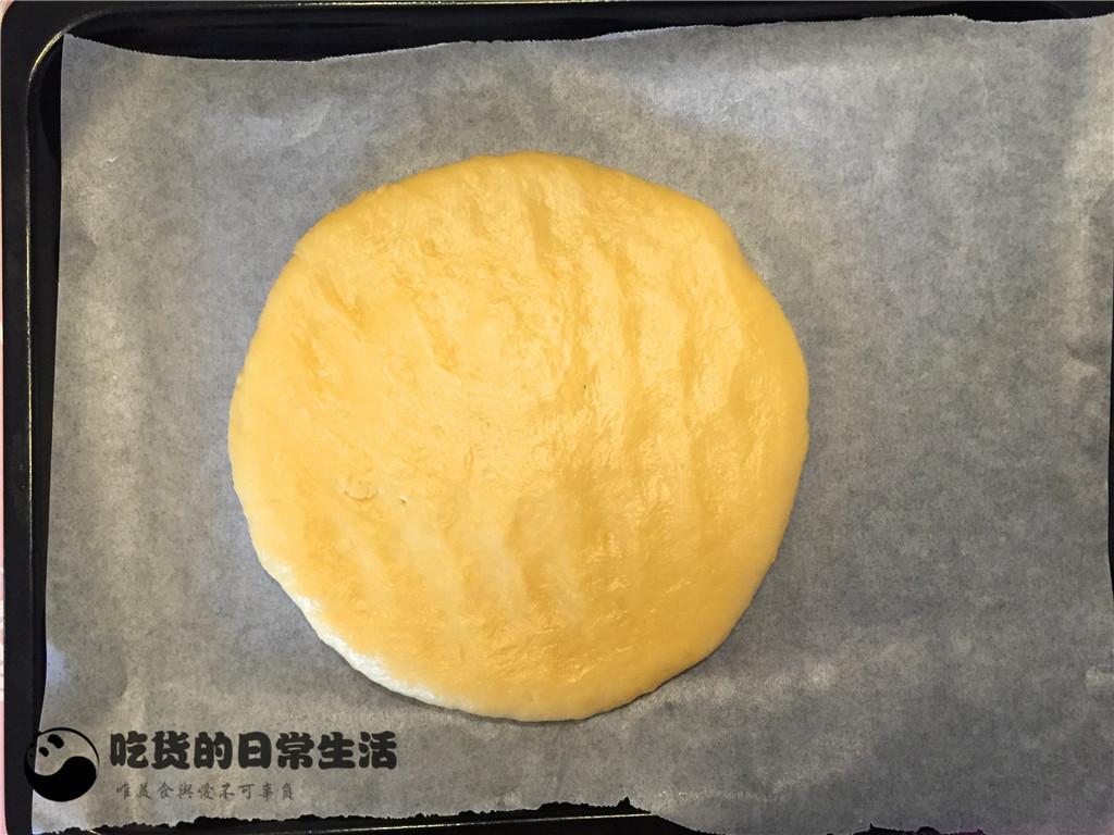 9、先將大塊的面團攤成8寸左右的餅。