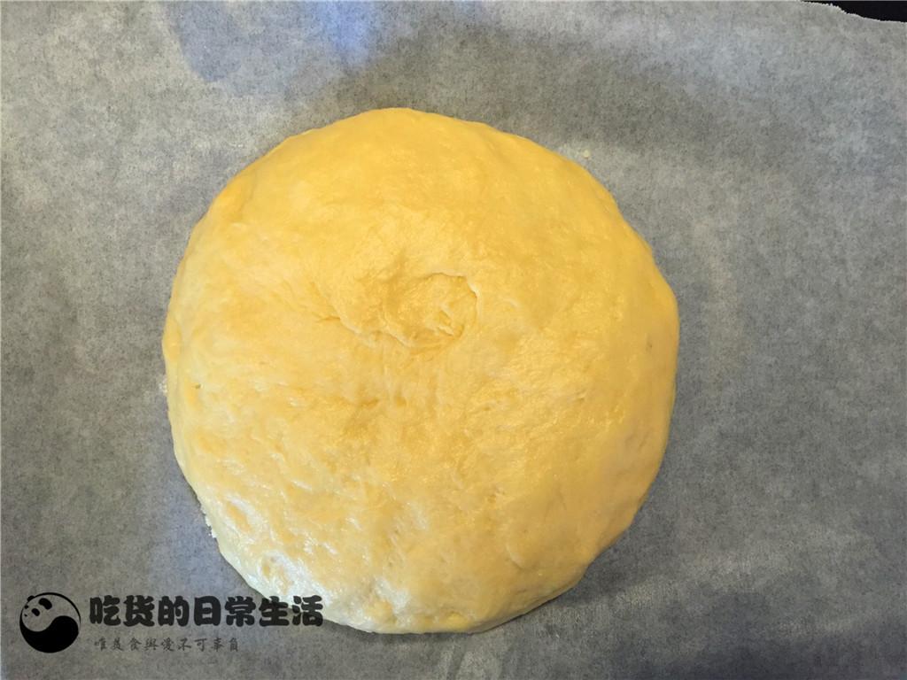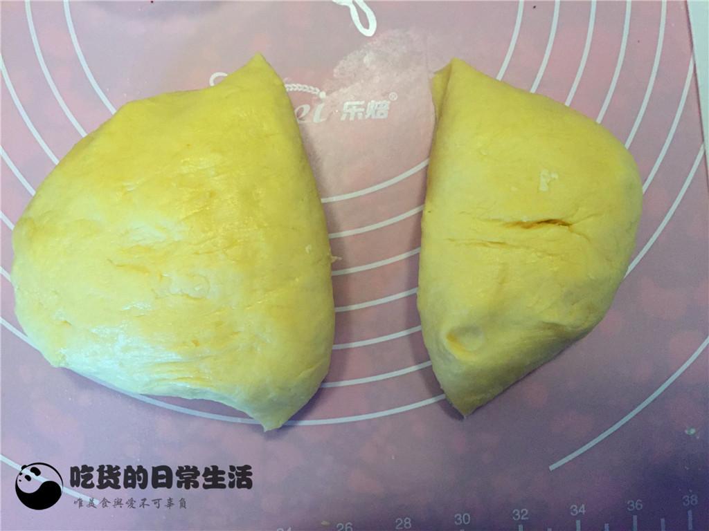 8、將面團分成兩份,可以等分也可以一塊大一點一塊小一點,我是分的大小份。