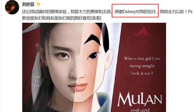 劉亦菲微博稱:“還記得試鏡時的情景,我愛木蘭的勇敢和無畏。感謝Dsiney對我的信任,我將全力以赴!Ps:影迷朋友們和網友朋友們做的圖好喜歡。”