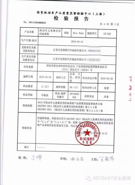 \u00A0\u00A0\u00A0\u00A0今年4月,國家質(zhì)量監(jiān)督檢驗檢疫總局在上海市質(zhì)量技術監(jiān)督局的檢測基礎上,對安全座椅行業(yè)進行了更高級別更深層次抽查。BESTBABY/佰佳斯特安全座椅通過國家級抽查!依據(jù)2015年機動車兒童乘員約束系統(tǒng)產(chǎn)品質(zhì)量國家監(jiān)督抽查方案,判定為合格!