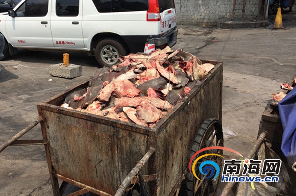 下午兩點(diǎn),南海網(wǎng)記者在水產(chǎn)碼頭附近看見(jiàn),兩輛垃圾車中裝滿了剛被解剖下來(lái)的鯊魚(yú)頭。從垃圾車處向右拐,在一個(gè)小作坊內(nèi)堆放著近百條錘頭鯊。其中一個(gè)男子正在用刀將一條條鯊魚(yú)解剖,地上血水橫流;另一個(gè)男子拿起剛解剖的鯊魚(yú)在水盆里輕輕一涮,便扔給另一旁的女子;該女子則負(fù)責(zé)往鯊魚(yú)上摸鹽腌制,待下一步風(fēng)干保存。南海網(wǎng)記者注意到鯊魚(yú)上的魚(yú)翅已不見(jiàn)蹤影,剩下的鯊魚(yú)肉每斤為15元。當(dāng)記者試圖詢問(wèn)是否知道所捕的鯊魚(yú)為錘頭鯊、在哪里捕獲時(shí),這些人均非常警惕,沒(méi)有正面回應(yīng),只是告訴記者“趕快買,馬上就沒(méi)有了!彪S后,南海網(wǎng)記者撥打12345反映相關(guān)情況,工作人員稱將會(huì)反饋給有關(guān)部門,有具體結(jié)果將立即通知。