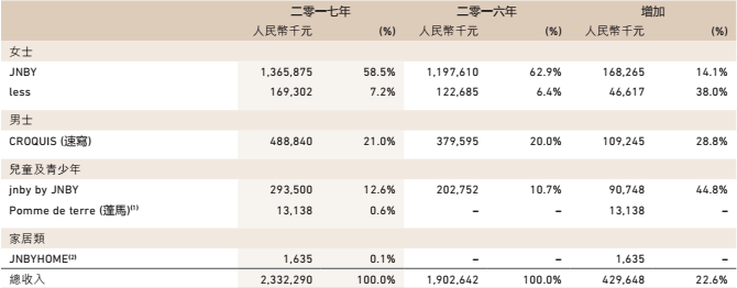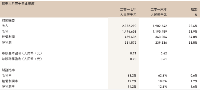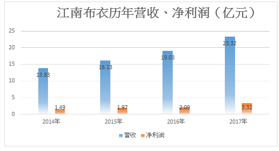 2017年9月18日,江南布衣交出了上市后第一個(gè)財(cái)年的答卷。報(bào)告期內(nèi)(2016年7月-2017年6月)實(shí)現(xiàn)營(yíng)業(yè)收入23.32億元(人民幣,下同),同比上漲22.6%;凈利潤(rùn)3.32億元人民幣,同比大漲38.5%,毛利14.75億元,按年升23.9%。